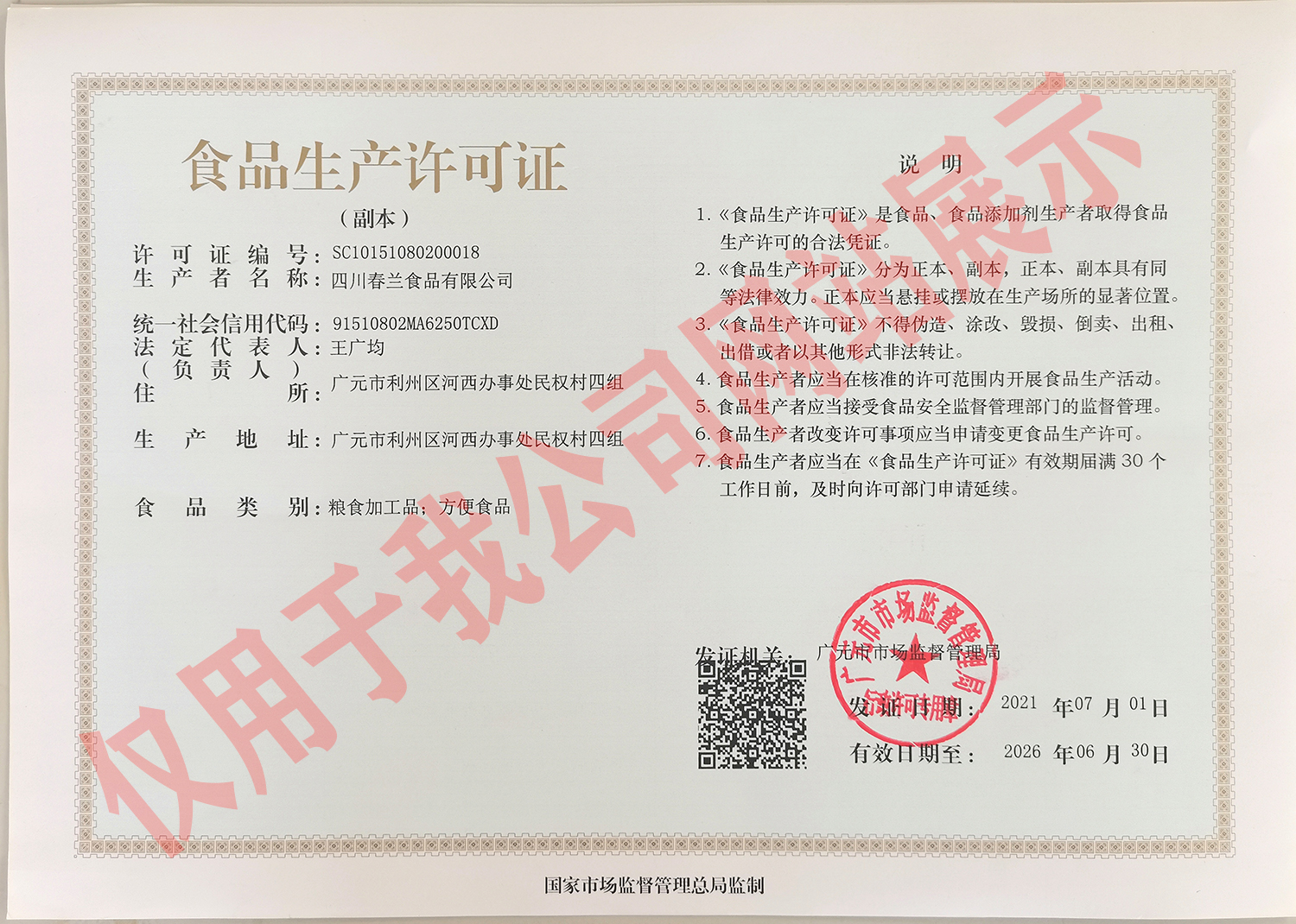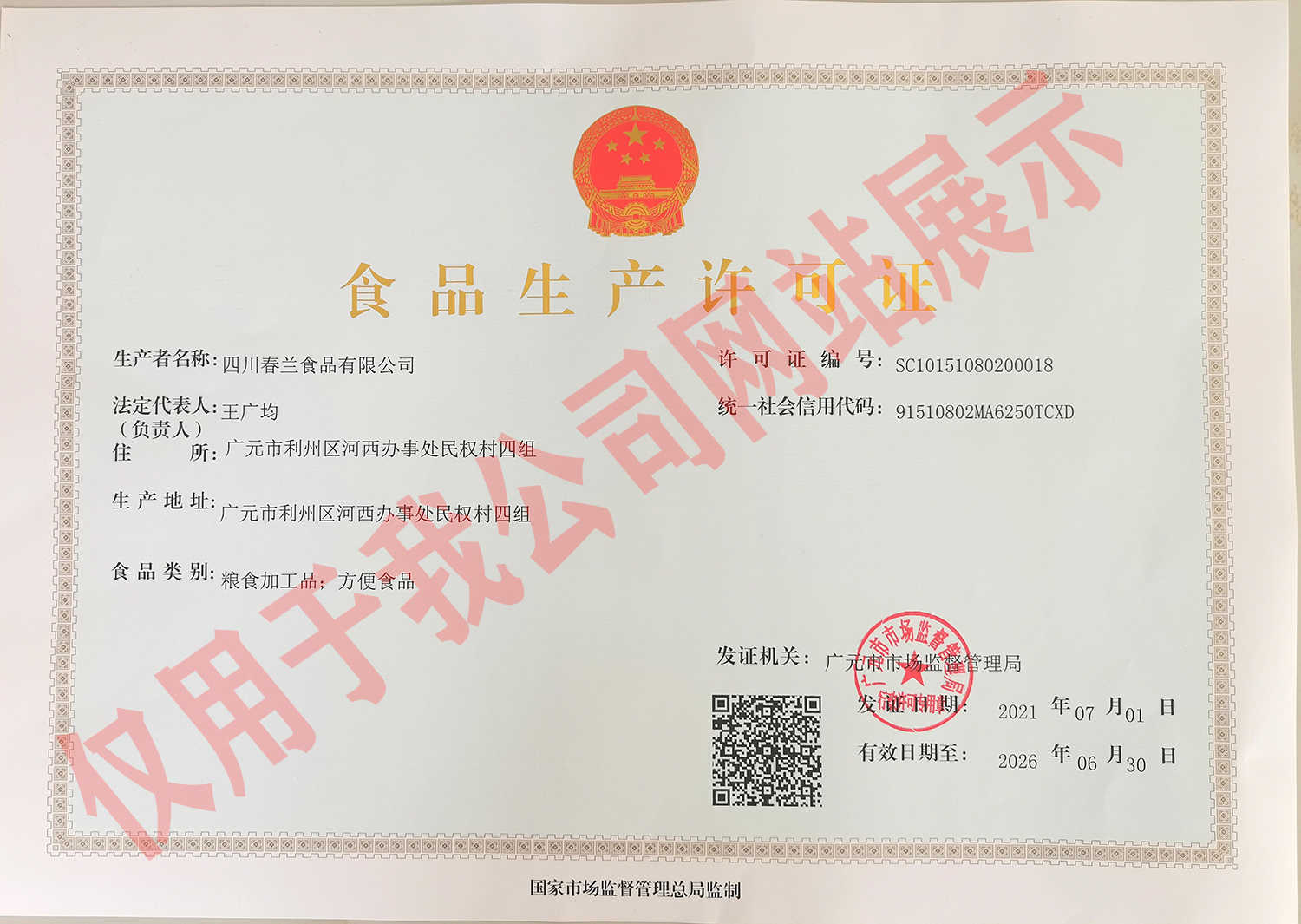 四川春蘭食品有限公司成立于2015年1月,主要從事生產天然曬干面、富硒沖調食品、富硒大米、富硒白酒等產品生產加工銷售企業。是以多元化、組合式發展為一體的綜合性企業。公司占地面積15余畝,注冊資金2000萬元,建有6000平方米標準廠房,擁有兩條全自動掛面生產線,一條沖調食品生產線,現有員工35人,專業技術及質量管理人員6人,具有年產1.5萬噸中高檔系列掛面、50噸富硒沖調食品和20噸富硒白酒的生產能力,年產值達八千萬元左右。公司研發生產的富硒掛面系列(富硒掛面、富硒香菇面、富硒苦蕎面、富硒粗纖維掛面、富硒綠豆面、富硒平菇面)以及普通曬干面為依托,公司注冊商標“悅福星”以地道的“農家味道”和“天然曬干”的特點,產品深受消費者厚愛。公司堅持以“質量促品牌,品牌促發展”的經營理念,加強品牌建設,提升質量管理,使企業在食品質量安全方面有了很大的提高,在今后的發展中不斷提升市場的競爭力。 ...... 更多